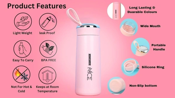 Nice Glass Water Bottles, Wide Mouth, Vaccum Flask BPA-Free Non-Toxic Plastic Shell Water Bottle for Boys, Girls & Kids, Leak Proof Skid Free Bottle with Handheld (400 ml, Multicolor)